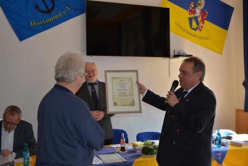 Außerdem standen Ehrungen auf der Tagesordnung. Die letzte "Amtshandlung" des scheidenden 1. Vorsitzenden war eine besondere Ehrung! Wolfgang Bercio wurde mit einem Bildband "Windjammer", einer Urkunde und einem Blumenstrauss für 30 Jahre Chorleitertätigkeit im Shantychor Dortmund geehrt.