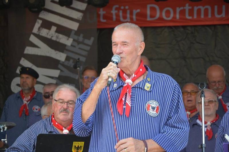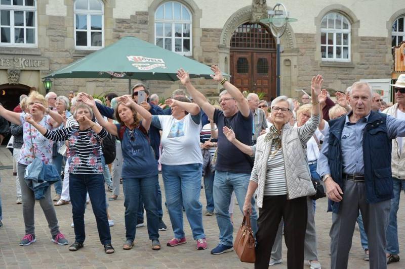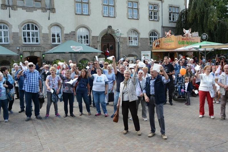 Kurz nach 13.00 Uhr enterten wir die Bühne und Wolfgang begrüßte die Gäste auf dem Aplerbecker Marktplatz. So langsam füllte sich auch der Platz vor der Bühne - denn die bereitgestellten Bänke und Tische waren schon lange besetzt.