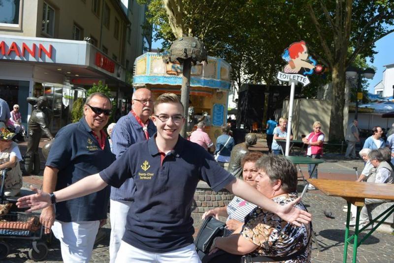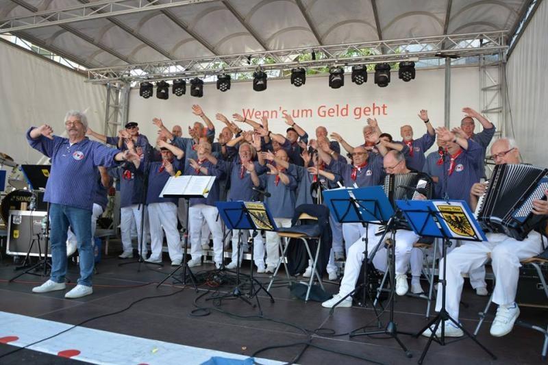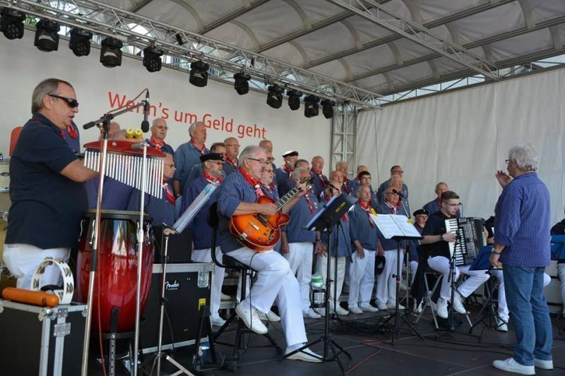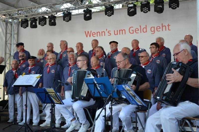 "Heut geht es an Bord" war unser nächster Titel und mit "Seemann, deine Heimat ist das Meer" luden wir alle Gäste ein, mit uns gemeinsam, "Mit dem Albertros nach Süden" zu fliegen. Auch heute durfte das "Gorch-Foch Lied" nicht fehlen. Wolfgang hat wieder den weißwesten Mann am Strand gesehen und zur Pause wurde noch einmal richtig aufgedreht: "Evergreens im Chorgewand" (u.a. mit dem River Kwai Marsch und Over in the Gloryland) ließen den Marktplatz beben.