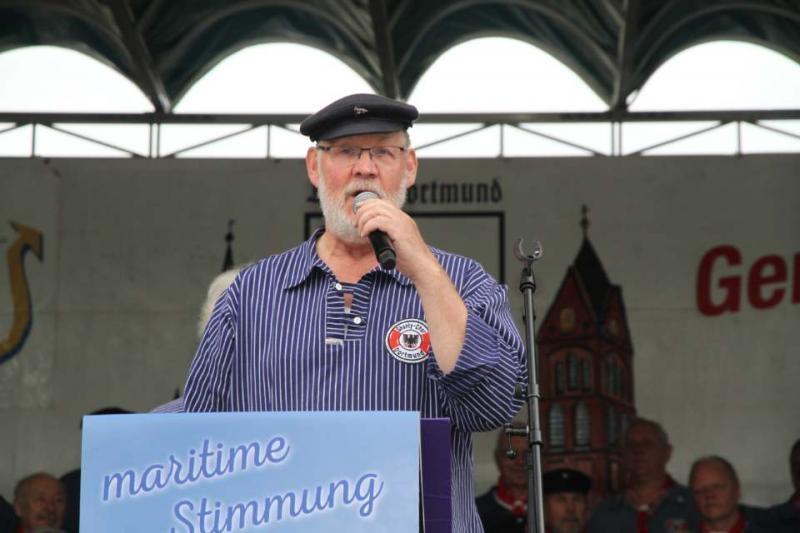 Mit dem Lied „Admiral of Scandinavia“ eröffnete der Shanty-Chor Dortmund um 11:30 Uhr, unter der Leitung von Wolfgang Bercio, den musikalischen Reigen mit beliebten Liedern von der Waterkant, maritimen Songs und Shanties. Die Gäste, Freunde und Fans wurden zum Mitsingen und Klatschen animiert – was diese auch begeistert annahmen.