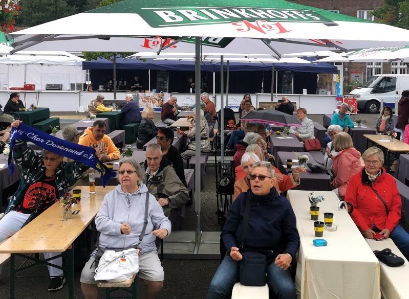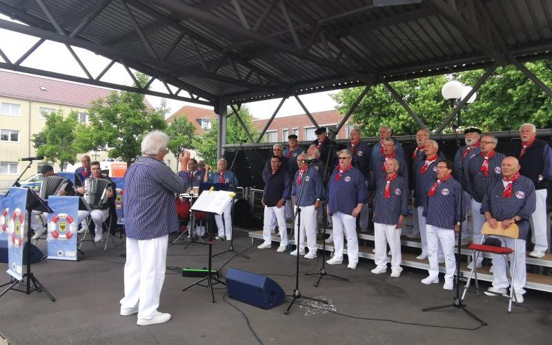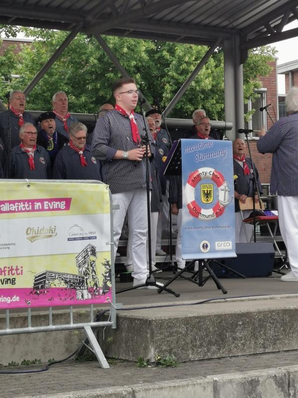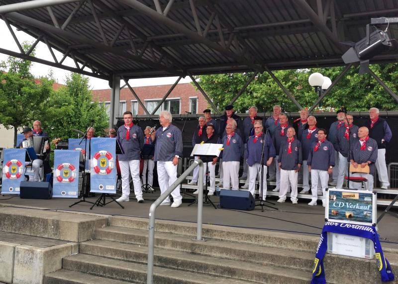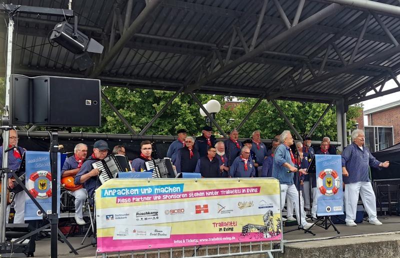 Dieses Jahr durften wir wieder auf der Bühne der Evinger-Mitte auftreten und die Festgäste mit unseren Liedern auf eine Reise in „die große, weite Welt“ mitnehmen. Viele Fans waren extra nach Eving gekommen um uns zu hören. Man sah zahlreiche Fanschals und unsere Lieder wurden kräftig mitgesungen . Leider war das Wetter nicht so prickelnd – bedeckt, etwas kühl und Nieselregen. Doch das gefühlte „Lofotenwetter“ ;-) tat der guten Stimmung keinen Abbruch. Im Gegenteil – man schunkelte und sang sich eben warm. Über eine Stunde entführten wir das Publikum in die große, weite Welt und brachten ein wenig „Nordseeluft“ auf den Festplatz. Wenn man die Augen schloss (und das „Kopfkino“ laufen ließ), glaubte der ein oder andere, sogar das Salz auf den Lippen zu schmecken. Jedenfalls machte der Auftritt unheimlich viel Spaß – dem Publikum und uns Akteuren. Wir freuen uns schon auf den nächsten Auftritt – wenn es dann wieder heißt: Anchors Aweigh - - Leinen los und Volldampf voraus! Euer Tastentippser
