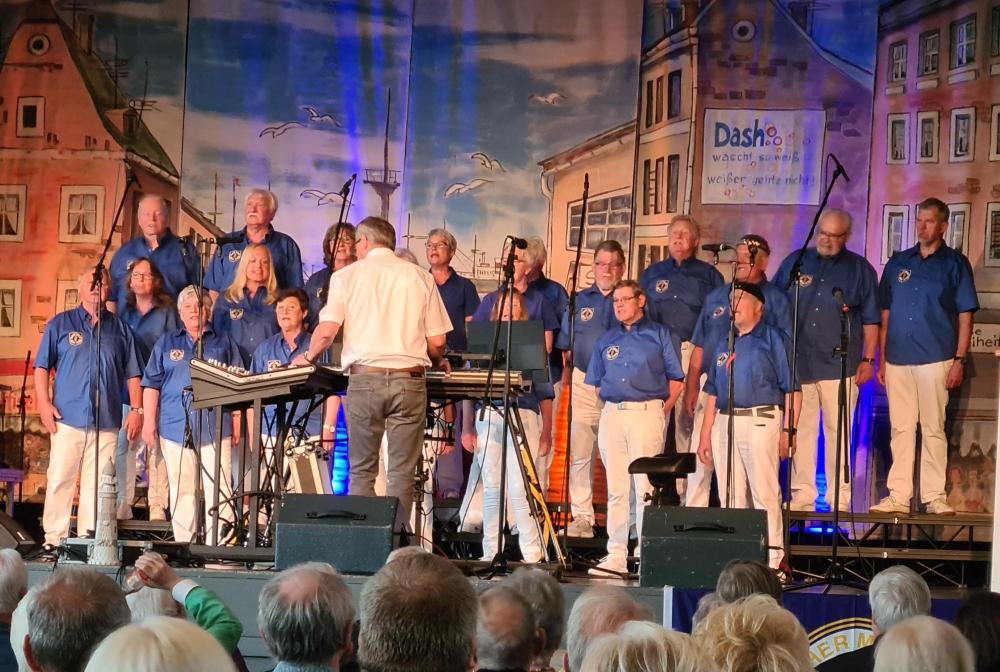Eine ganz große Ehre kam unserem Chorleiter, Lukas Blume, und unserer Combo zu teil. Das große Finale, an dem alle Chöre auf bzw. vor der Bühne standen und gemeinsam die Abschlusslieder "Kneipe am Moor", "Gorch Fock Lied" und "Wir werden uns Wiedersehen" sangen, wurde durch unsere Combo begleitet und Lukas durfte den "Großen Chor" dirigieren! EIne ganz große Auszeichnung und Geste - obligt diesdoch normalerweise dem Ausrichter!