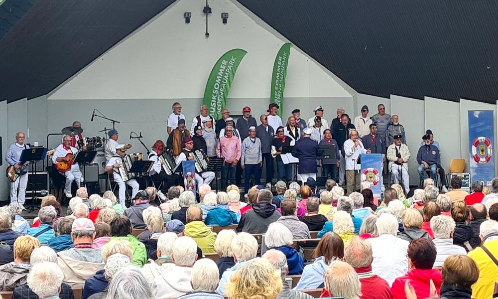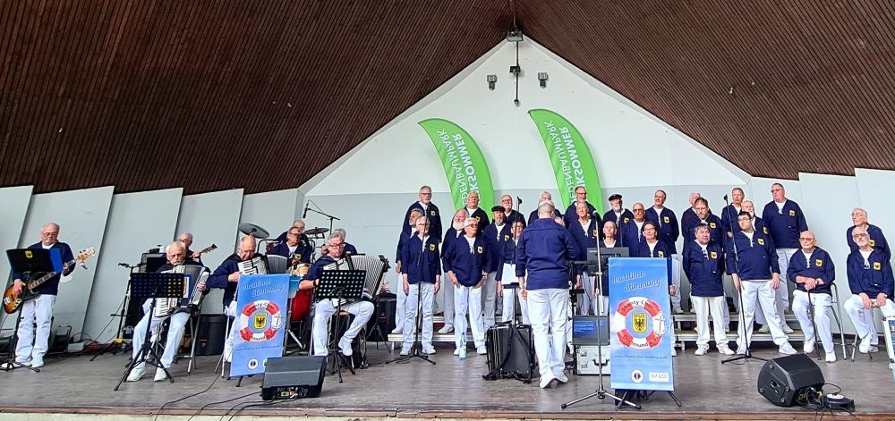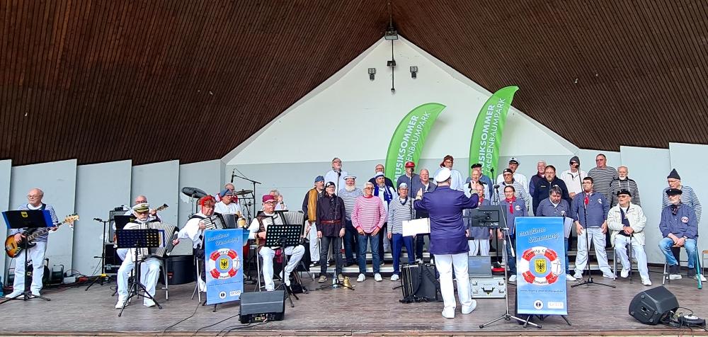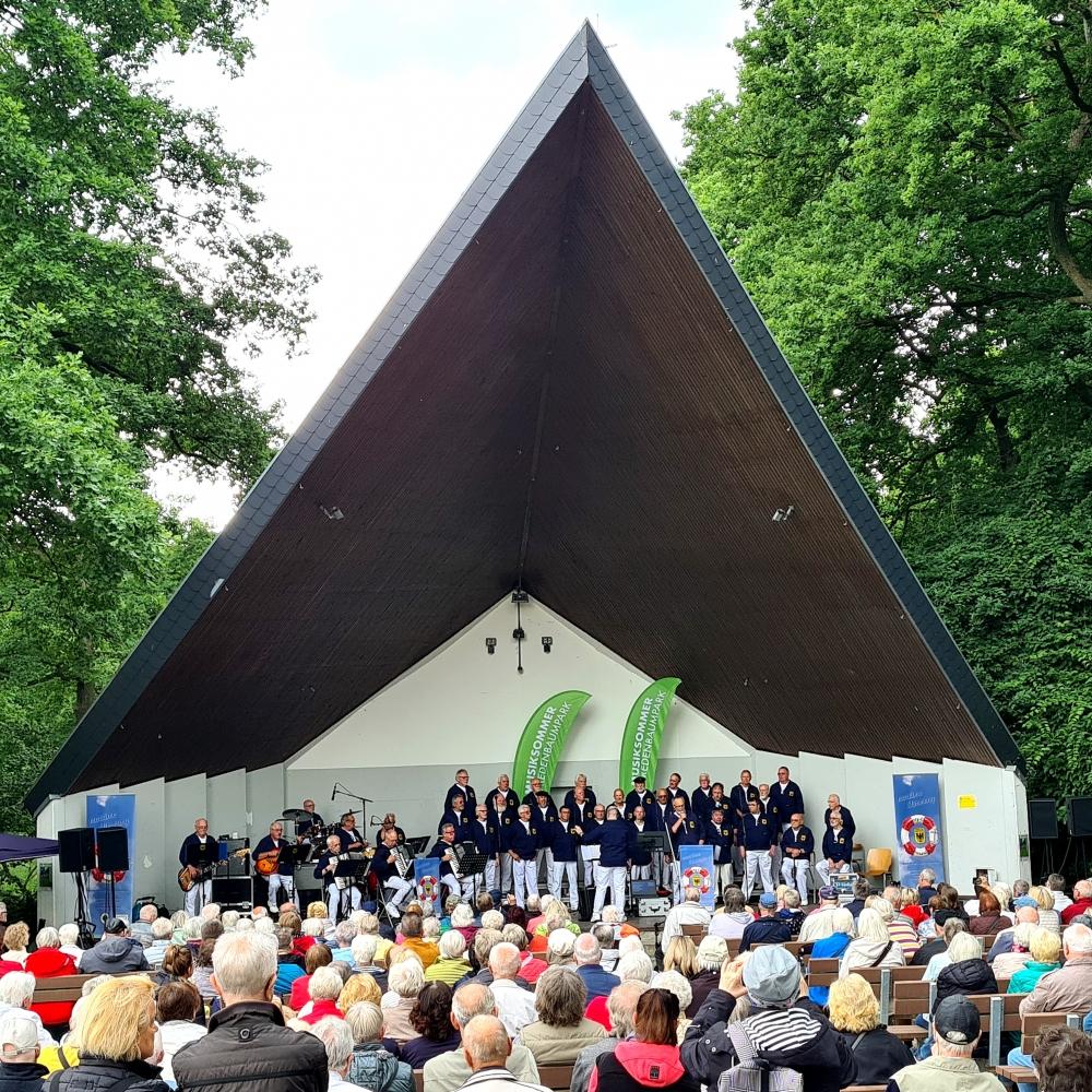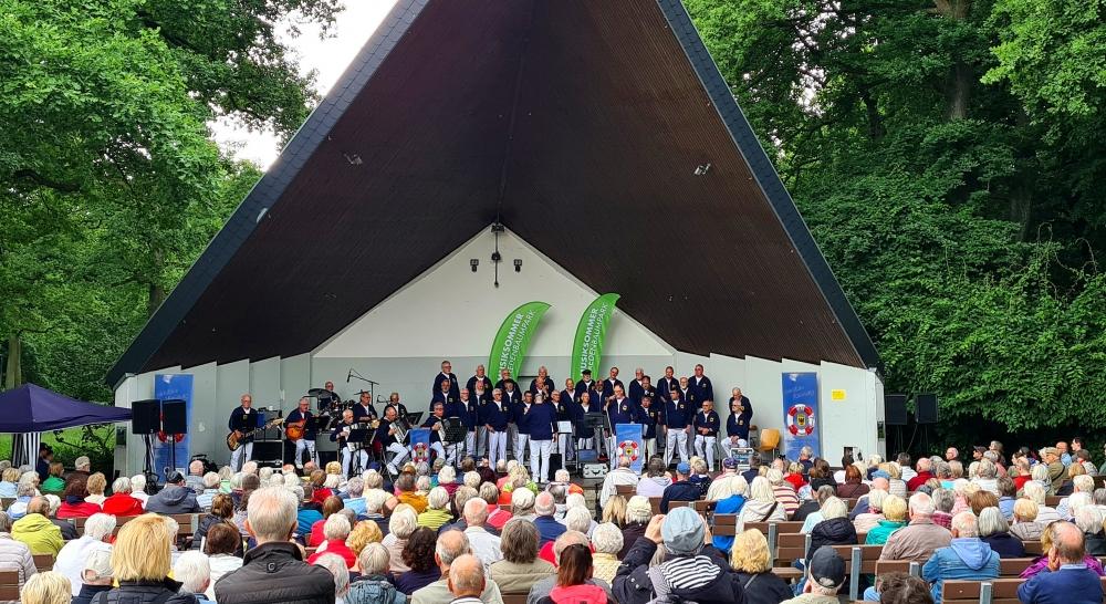 Goss es vorher (am gesamten Pfingstwochenende!) wie aus Kübeln, so lockte das trockene Wetter am Pfingstmontag die Fans der maritimen Musik in Scharen an den Musikpavillon in den Fredenbaumpark - und das bei angenehmen Temperaturen. Selbst die Sonne lugte hinter den Wolken hervor und lachte mit den Gästen und dem Chor um die Wette.
