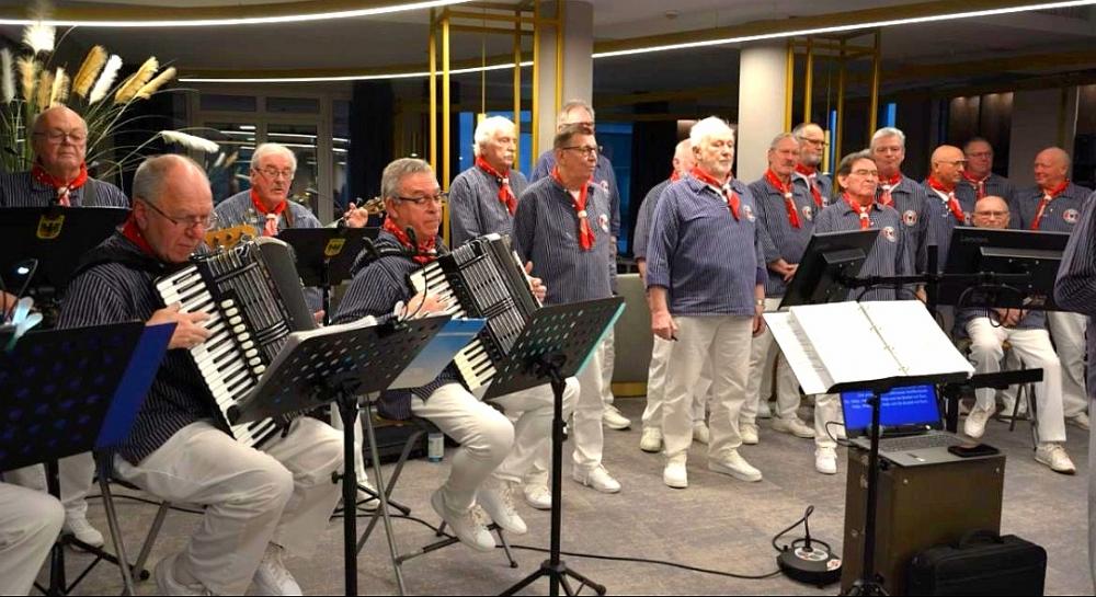 Mit bekannten Liedern wie „Seemann, deine Heimat“, „Heut geht es an Bord“ oder dem „Gorch Fock Lied“ zogen wir das Publikum direkt in unseren Bann. Auch die Lieder „Santo Domingo“ und „Capri-Fischer“ wurden kräftig mitgesungen. Die tief aus der Versenkung geholten Stücke „In Johnnys Kneipe“ und „Und dann geht es mit Volldampf nach Hause“ kamen beim Publikum auch sehr gut an.